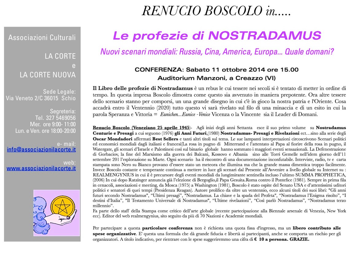 Abbiamo evidenziato come le remote lungimiranze degli Antichi stanno all’Ourobos cosmico che si chiude come un Cerchio perfetto o sfera o sfere dell’Oceano cosmico con le sue Acque(Idrogeno) del Principio (Bereschith biblico) incluse le Acque finali non del Diluvio bensì del fecondo Delphos o Utero della stessa Vita perché senza le Acque o questo Elemento non c’è vita, o meglio non c’è energia. Ovvero acque ossigeno ed Idrogeno et cetera – c’è quanto serve ad far funzionare il motore all’OSSIDROGENO , che ogni ingegnere dovrebbe progettare, senza tabù o schiavitù al sistema bestiale che se continua così porta il mondo davvero alla sua perdizione apocalittica o pollution fatale. Ecco la ragione per cui su questa strada dell’OSSIDROGENO fa seguito l’esempio del genio dei motori per portare alla luce tale soluzione e anticipazione come vedi esposta e guarda caso in perfetta sintonia con la profezia del nostro, da tempo(20 anni) già anticipata al Costanzo Show da Boscolo.
