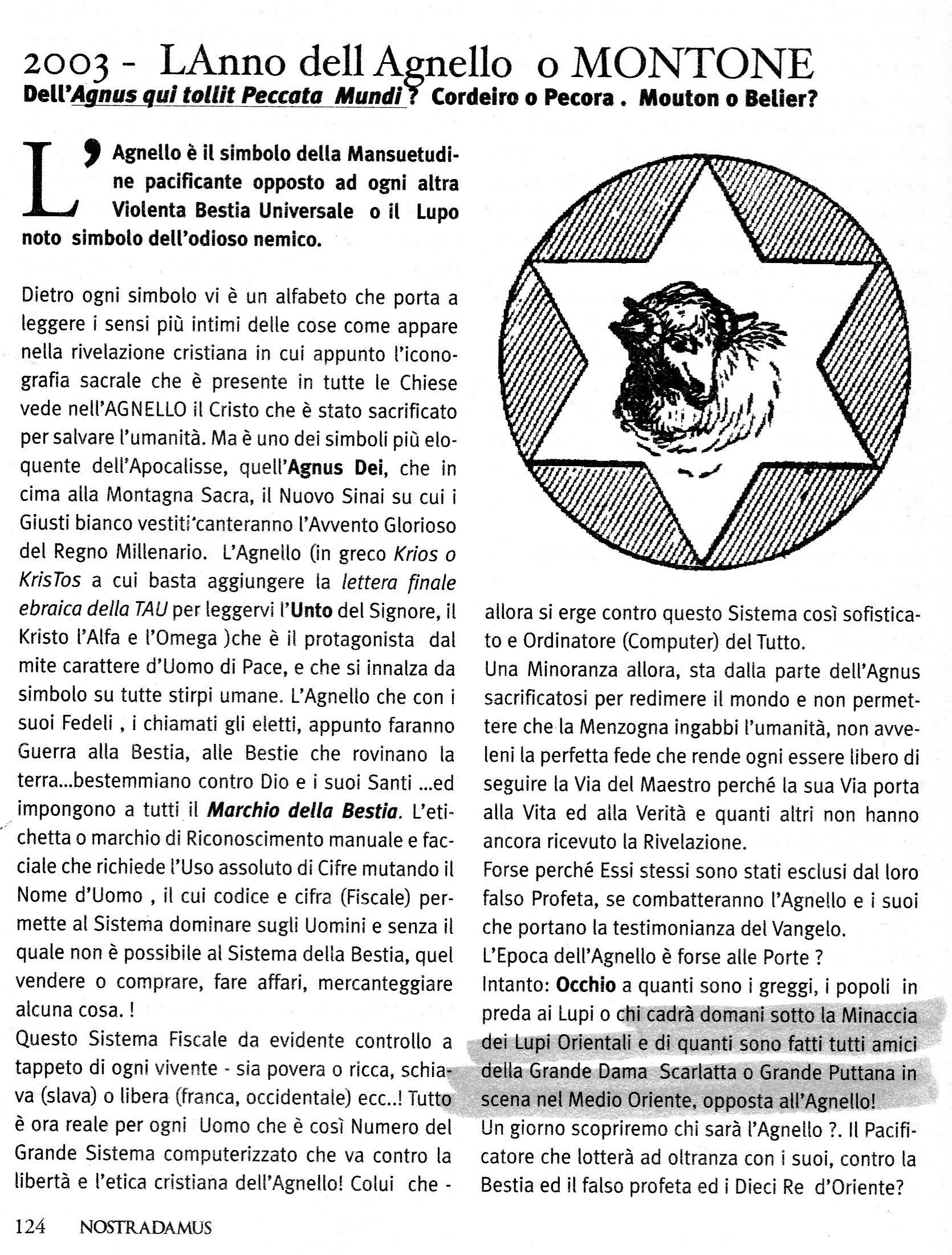 L’ultimo Anno Agnello Montone ha visto preannunciato gli Agnelli mandati allo sbaraglio o capri espiatori sino ad essere celebrati sull’Altare della Patria (Missione Babilonia 2003)e quanto sia coinciso il riferimento ad Agnelli(Fiat) e la sua fine . Allora il sommo denominatore enumerale bene esposto nell’Almanacco era di: Distruzione, rotta & rottura, sgretolamento. Svoltiamo pagina per ripeterci nell’antitesi che il MONTONE (Mouton in francese, El Mout in arabo la MORTE) così sempre abbinato alla Celeste Astrologia dei Segni Cinesi , il segno nostrano (quanto esposto da decenni negli Almanacchi di Nostradamus) sta al Segno del MONTONE cinese equipollente allo SCORPIONE.