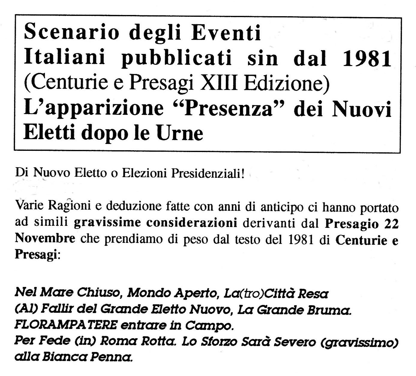 Quindi già nel 1993 Boscolo aveva previsto gli attentati di matrice islamica che otto anni dopo avrebbero scosso l’America e il mondo, e inoltre a quell’epoca non poteva certo sapere delle mire iraniane per ottenere la bomba atomica. Ma è verosimile che l’Iran, probabile alleato dei russi in caso di conflitto contro l’Occidente , se la prenda con la Svizzera ? Sì, se si pensa che il bersaglio simbolico da colpire potrebbe essere la sede europea dell’ONU, che si trova a Ginevra, città che per l’appunto è lambita dal massiccio del Giura… – E quando mai dovrebbero accadere questi terrificanti fatti ? “Non subito” – aveva detto Boscolo 21 anni fa – prima deve arrivare a maturazione il conflitto balcanico( cosa non ancora allora all’orizzonte) e deve morire Woytila”. Il conflitto balcanico si è concluso nel 1995(1999-2000) e Papa Giovanni Paolo II è deceduto nel 2005 : ormai dovremmo essere vicini… Sul settimanale Azione del 17 agosto 1995 Edgardo Bartoli aveva dedicato un articolo a Nostradamus, soffermandosi fra l’altro su ciò che il celebre nostradamologo romeno, Vlaicu Ionescu, aveva rivelato in un’intervista-libro alla giornalista francese Marie-Thérèse De Brosses . Scriveva Bartoli citando l’esperto romeno: “un’imponente invasione islamico-asiatica devasterà l’Occidente e distruggerà Gerusalemme; l’America interverrà, seppure con ritardo, ma poi precipiterà nella rovina più totale a causa del suo eccessivo attaccamento alle ricchezze di questo mondo. Un piccolo dettaglio : nel bel mezzo di questi avvenimenti, l’Italia sarà devastata da una rivoluzione”. V’è da sperare che sia Boscolo e sia Ionescu abbiano commesso qualche errore nell’interpretare le enigmatiche quartine delle Centurie. E però bisogna ammettere che, a distanza di circa 20 anni, vi sono tutte le premesse perché il terribile scenario da loro descritto in tempi non sospetti si avveri : la guerra in Ucraina e conseguente braccio di ferro fra la Russia e l’Occidente , la guerra in Siria, la creazione di un Califfato islamico tra Siria e Iraq che rappresenta una minaccia anche per Israele, le titubanze di Obama e la riluttanza degli USA a un intervento diretto, la situazione economica che secondo taluni esperti potrebbe riservare amarissime sorprese in Europa e negli USA già nei prossimi mesi . Tutte coincidenze casuali ? Non dimentichiamo che anche Papa Francesco ha detto che la terza guerra mondiale è già iniziata, e forse potrebbe essere lui il Pontefice che secondo Nostradamus sarebbe destinato a perire in un attentato in una città attraversata da due fiumi e che ha per insegna FERTSODHOMICIDE.