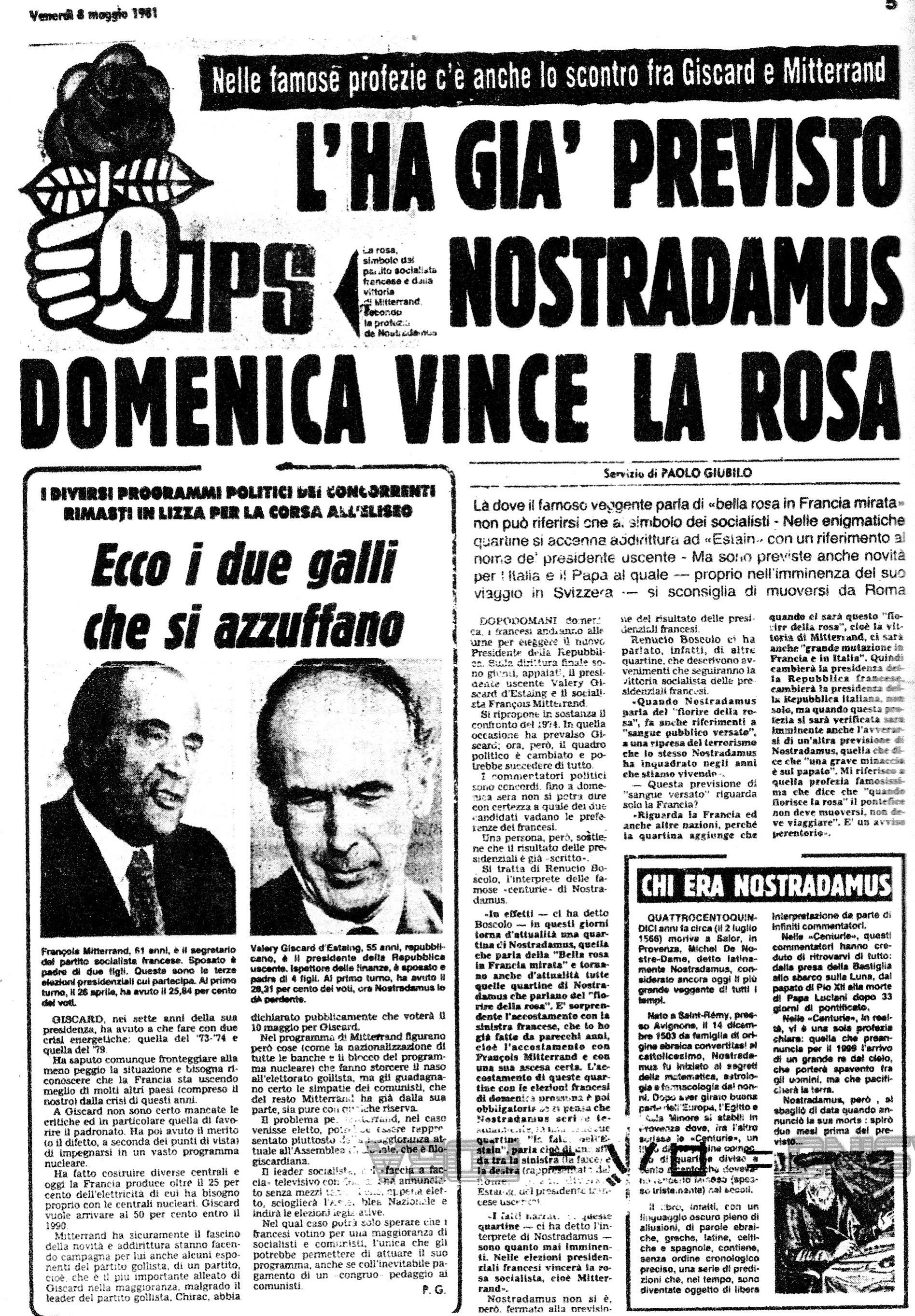Che allora così si abbinò l’altra straordinaria coincidenza legata al Fiorire della Rosa – della celebre profezia di Michel Nostradamus, che era già da tempo diffusissima sui rotocalchi, mensili, settimanali e quotidiani , radio e televisioni italiane e straniere ad opera dei miei libri che tanti cercavano di contraddire, smentire e giudicare profezia impossibile o riempire pagine come fosse un bufala che invece come un boomerang ha lasciato un segno indelebile nela nostra Storia .
