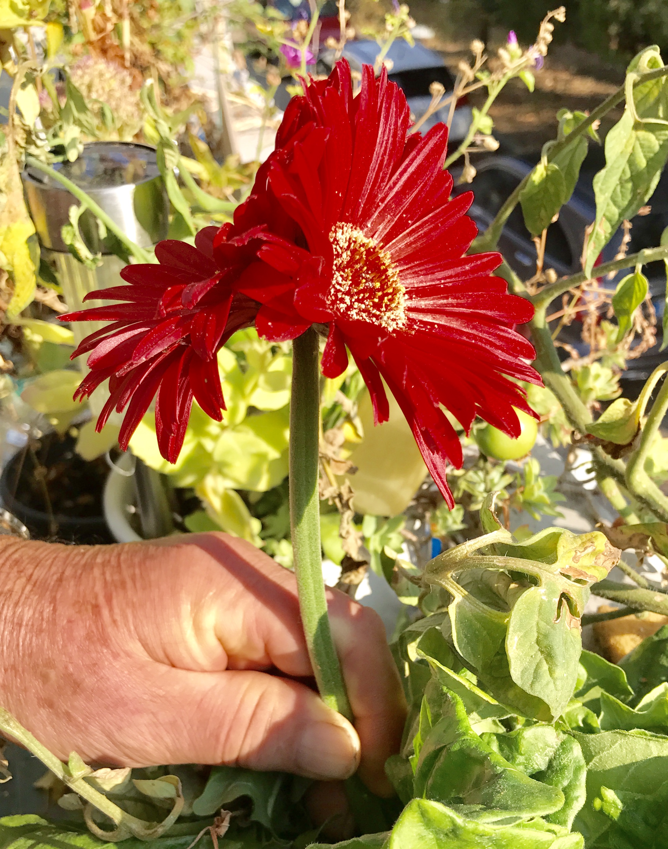 Quest’anno il balcone posto a NORD-EST al Levante – si è arricchito di una curata e a long… lussureggiante distesa di piante e fiori. Una pandora in particolare è spiccata per il suo fiammante fiorire dell’avvampante colore cremisi, rosso fuoco. Una fioritura dopo fioritura sinché in ultimo ecco la meraviglia e sorpresa una singolare gerbera rossa a due teste (gemella)su un unico stelo. La Famiglia delle (nome scientifico, Leuco, dal greco Bianco)è Leucanthemum – <LEEW…CANTHE……THEMUN ?>