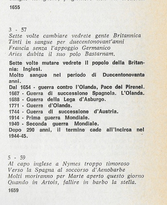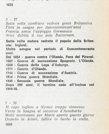 Ecco un esempio di altre quartine sestina e presagi che avranno un peso non trascurabile sul destino della nomea avversa della Perfida Albione che ha ancora altre guerre ARIES-ARES sul suo futuro conto !Ma non affrettiamo sentenze che spettano ai posteri ed ai futuri lettori ed esegeti del domani…sviscerare a tempo “mature time – ovvero mature censunto al momento giusto= mature time ! .Qui richiamo quel verso dei Trenta di Londra che segretamente (angolo in inglese coin – the angle ) Congiureranno…..Prendere le armi e il Nome Britannico(di re) Triste Anglicano sarà tardi avvisato…etc…qui ci vuole la famosa giallista inglese per decifrare le cose e le vicissitudini passate e del futuro dramma ancora intriso di un giallo che riserva la storia.