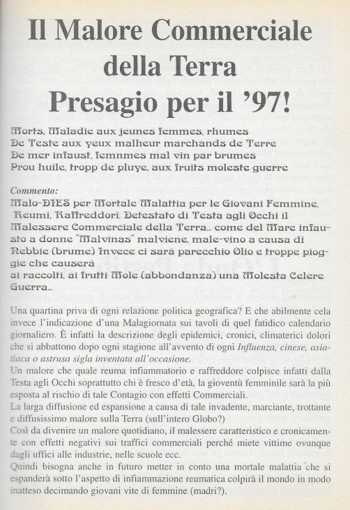 Decadi di storia e scenari racchiusi nelle quartine e sestine, non sono mai strati presi ad esempio e impostato il giusto topos- posto e modo per assimilare il contenuto tramandato secondo i canoni ermetici che tali scritti hanno sempre comportato, leggibili solo dagli esperti in questo campo, come lo sono altri nei settori sofisticati delle scienze o asettici templi della conoscenza di ogni branca dello scibile umano.