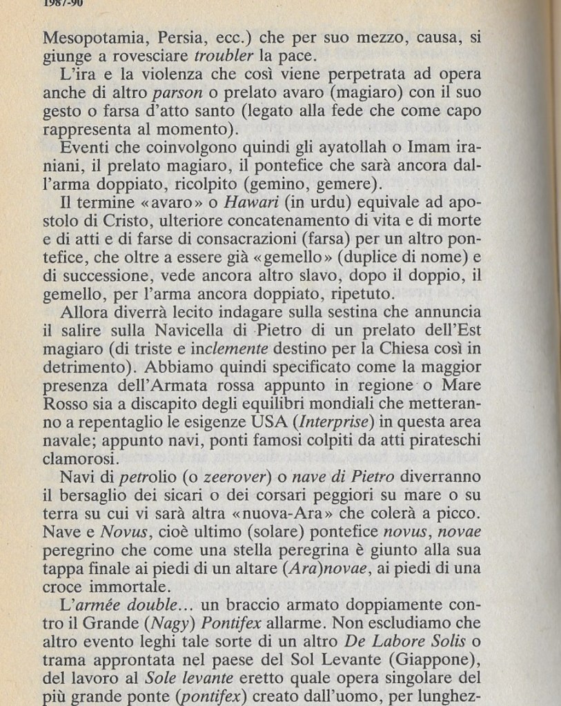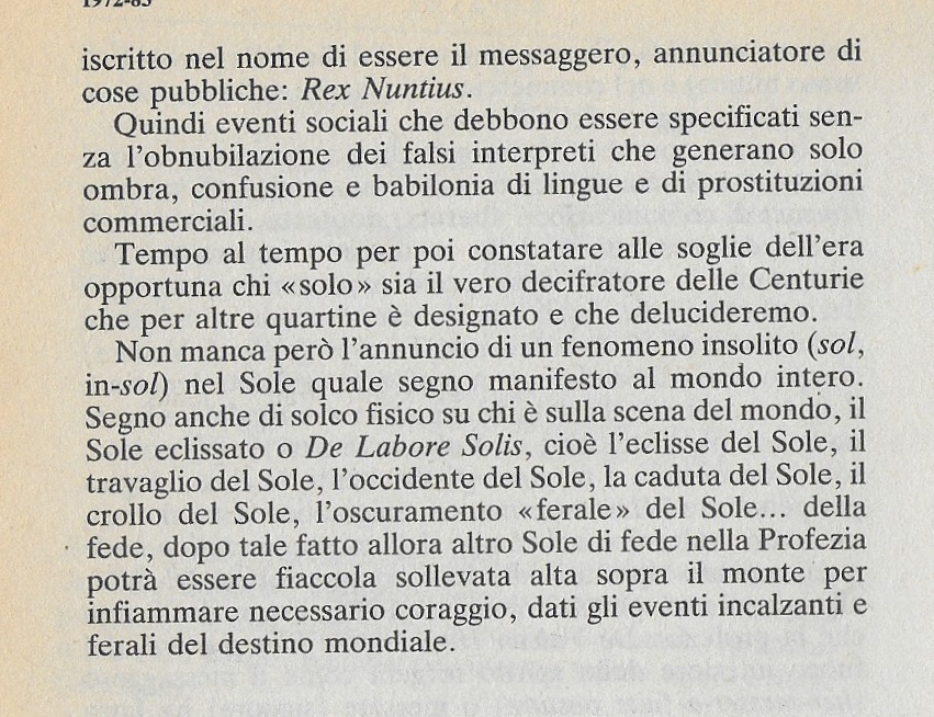 Si delinea allora una escalation,il Clima da oggi in poi ,anno dopo anno l’ Aria che tira (ARIAD) di Eclissi future su cui focalizzare datazioni e riferimenti topologici – Anche ponderando chi semmai qui sia il Sol celato (One-alone) invece chi è il Solo che come una eclisse, Eclat du Bois…(legno)quanto sarà lampante nel lettera Farnese che porterà alla Luce…il Vulcanico Messaggio d’emissario d’HEMRISSS – Ermetico di cui sarà fatta pastura- cibo (pasturin-boscatamata in greco) Cibo, conoscenza. Allora il Sole fisico diverrà la vera luce rutilante et onda bionda – che illuminerà ogni rivoluzione, brillante rivelazione in escalation .